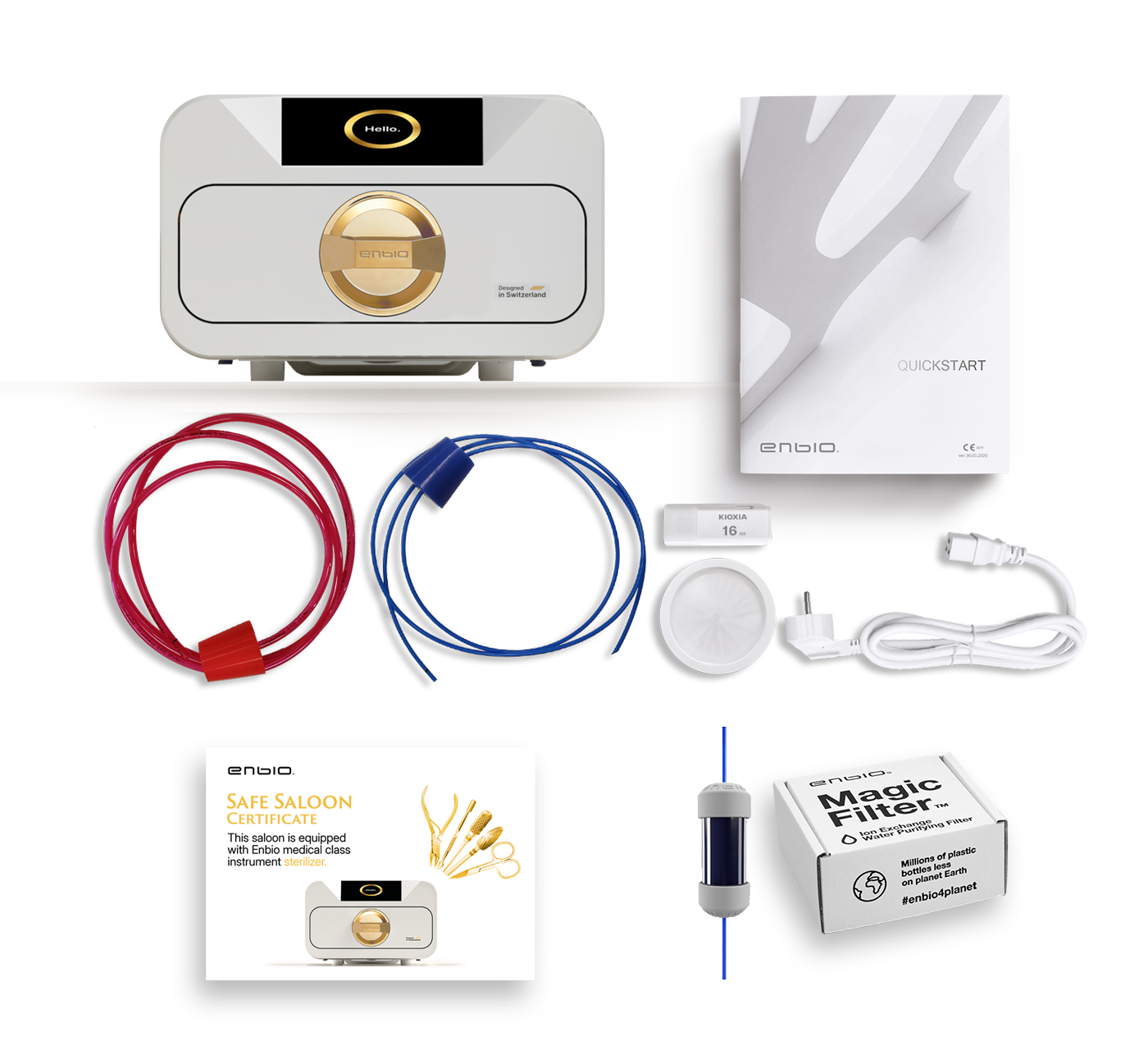 Kompletny zestaw zawiera najnowszą wersję Autoklawu ENBIO S Beauty Edition, filtr Magic, certyfikat oraz paszport